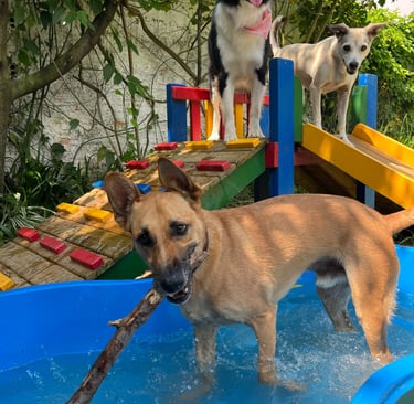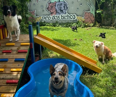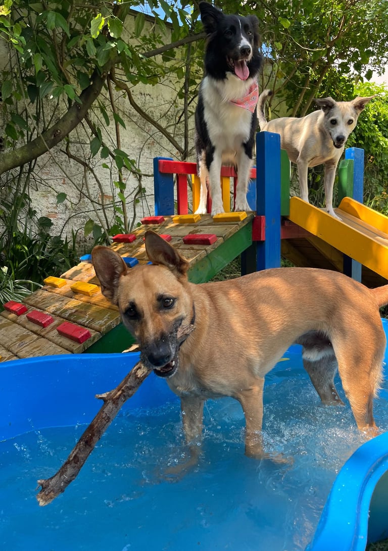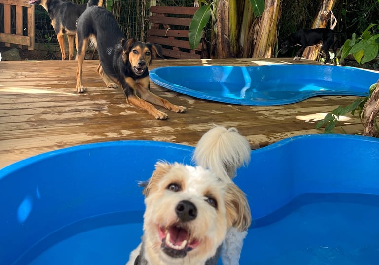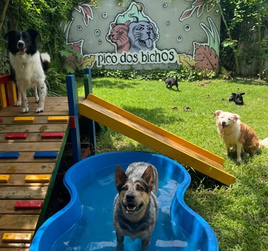 A piscina é liberada nos dias mais quentes, sempre com supervisão e respeitando o perfil de cada cão. Um momento livre, divertido e refrescante — do jeito que eles amam.