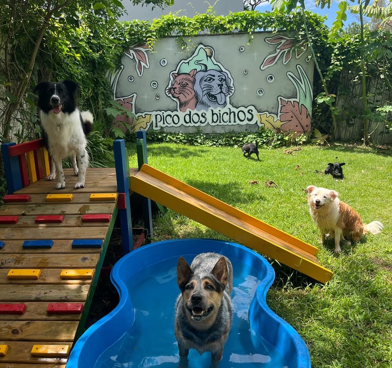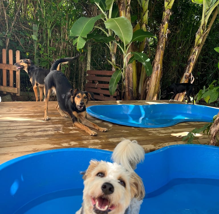A piscina é liberada nos dias mais quentes, sempre com supervisão e respeitando o perfil de cada cão. Um momento livre, divertido e refrescante — do jeito que eles amam.
